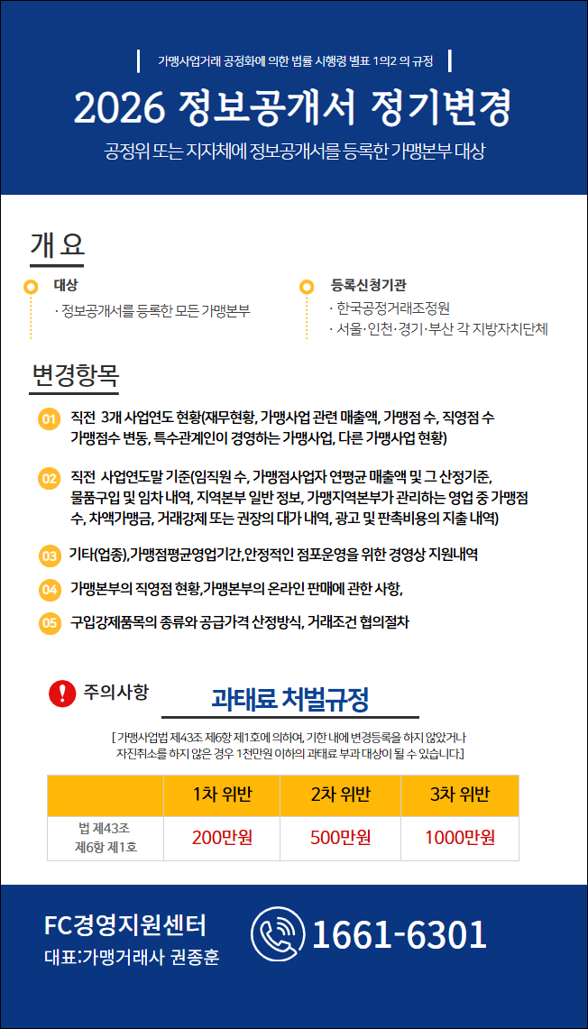 2008년도 02월 04일 부터 시행되었으며 프랜차이즈 가맹본부는 정보공개서를 가맹사업법의 형식에 맞게 작성하여 공정거래조정원 또는 지자체에 등록해야 하며 정보공개서에 기재하여야 할 항목은 다음과 같습니다.